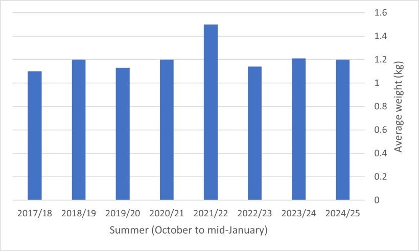 Figure 6: Average weight of maiden rainbows kept by anglers on Lake Taupō for the summer period from 2017/18 to 2024/25. | DOC