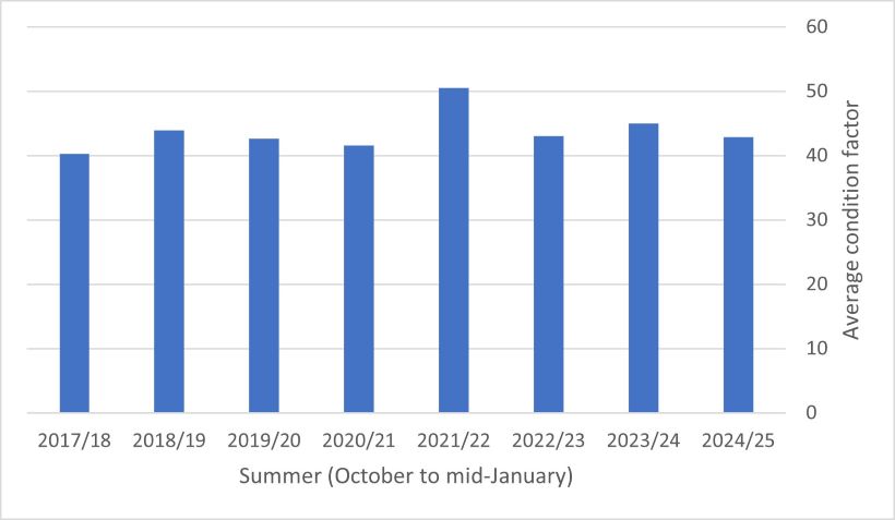 The average condition factor of maiden rainbow trout kept by anglers in 2024/2025 was 42.9 which is down slightly on the previous summer’s average of 45, but on par with the summer of 2022/23 when it was 43 (Fig. 7).