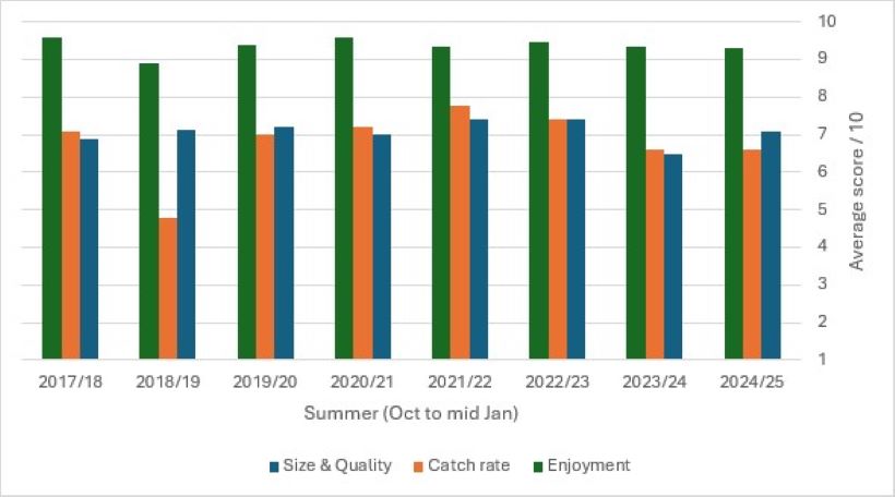 Despite the estimated catch rate for anglers in 2024/25 being the second highest out of the last eight summers (Fig. 1), anglers rated their success at 6.6 which is on par with the same period last summer. Success was rated between 7 and 7.8 in the summers from 2019/20 to 2022/23.