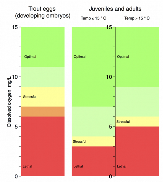 A dissolved oxygen concentration of 5.0-5.5 ppm can be tolerated by free-swimming brown trout but should be at least 80% saturation. The incipient lethal level of dissolved oxygen concentration for adult and juvenile brown and rainbow trout is around 3 ppm, or less depending on environmental conditions, especially temperature. The importance of the temperature is because cold water can contain far more oxygen than warm water (Fig.1).