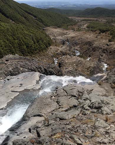 The track then descends into the expansive Mangaturuturu Valley via the Cascades, where a mountain stream tumbles over a spectacular rockfall. The rocks are coated with a creamy-coloured silica deposit left behind by the fast flowing stream. Caution: the rocks can be slippery during wet or icy conditions.