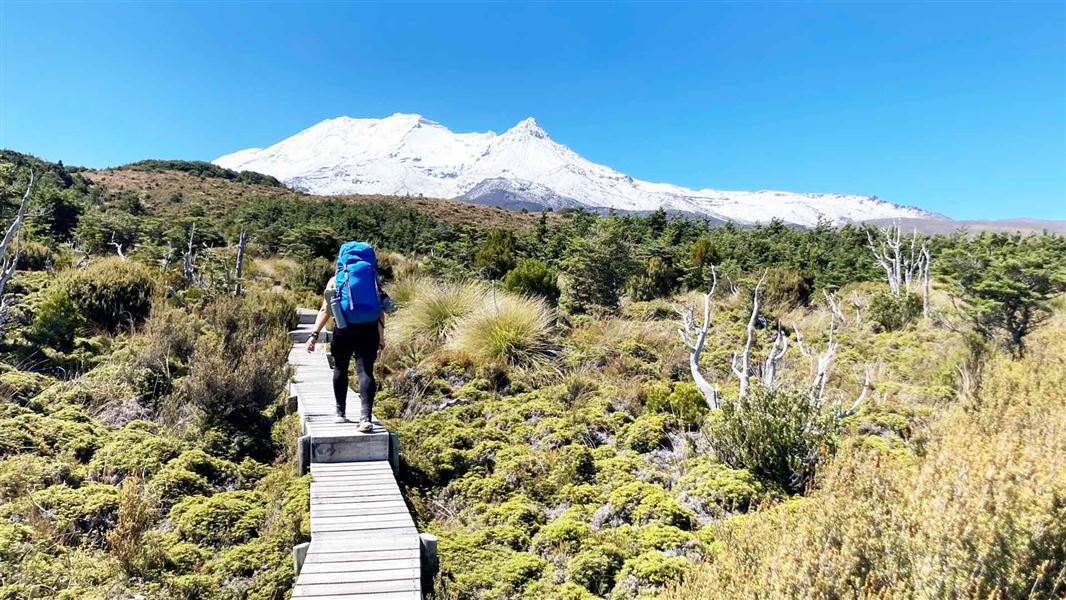 Tramper on a board walk with Mt Ruapehu in the distance.
