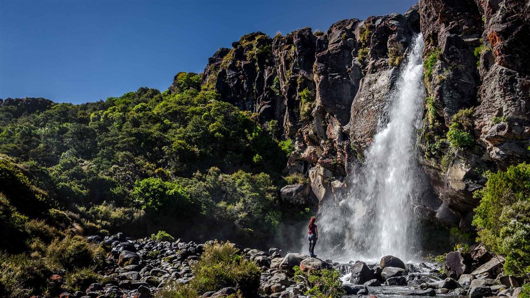 From the forest edge the track passes over the Wairere Stream with impressive views of a small narrow gorge. Continuing on up the track, Taranaki Falls comes into view tumbling 20 metres over the edge of a large andesite lava flow which erupted from Ruapehu 15,000 years ago.