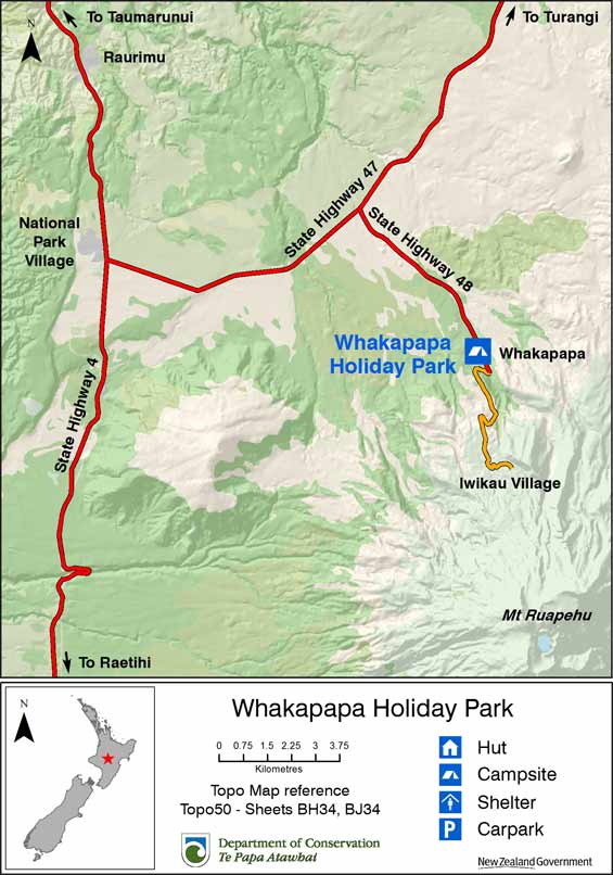 From National Park Village turn onto SH 48 and travel 6.4 km to Whakapapa Village. The holiday park is adjacent to the Tongariro National Park Visitor Centre.