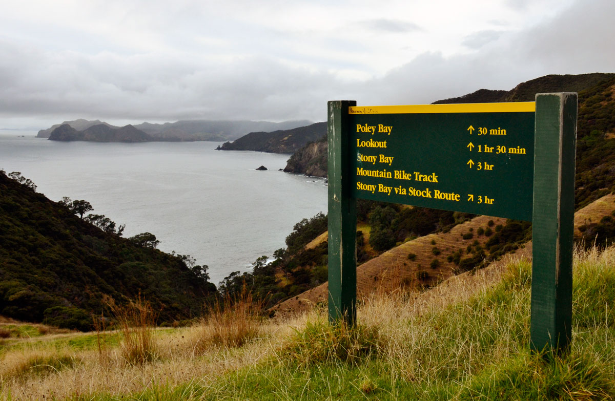 The coastal walk between Stony and Fletcher Bays crosses farmland and goes through coastal forest with views of the Pinnacles, Great Barrier Island (Aotea Island) to the north and Cuvier Island (Repanga Island) in the east. The track follows an easy gradient with a short steep section in to and out of Poley Bay. It is part of an old bridle path formed by early pioneers to link the two bays.