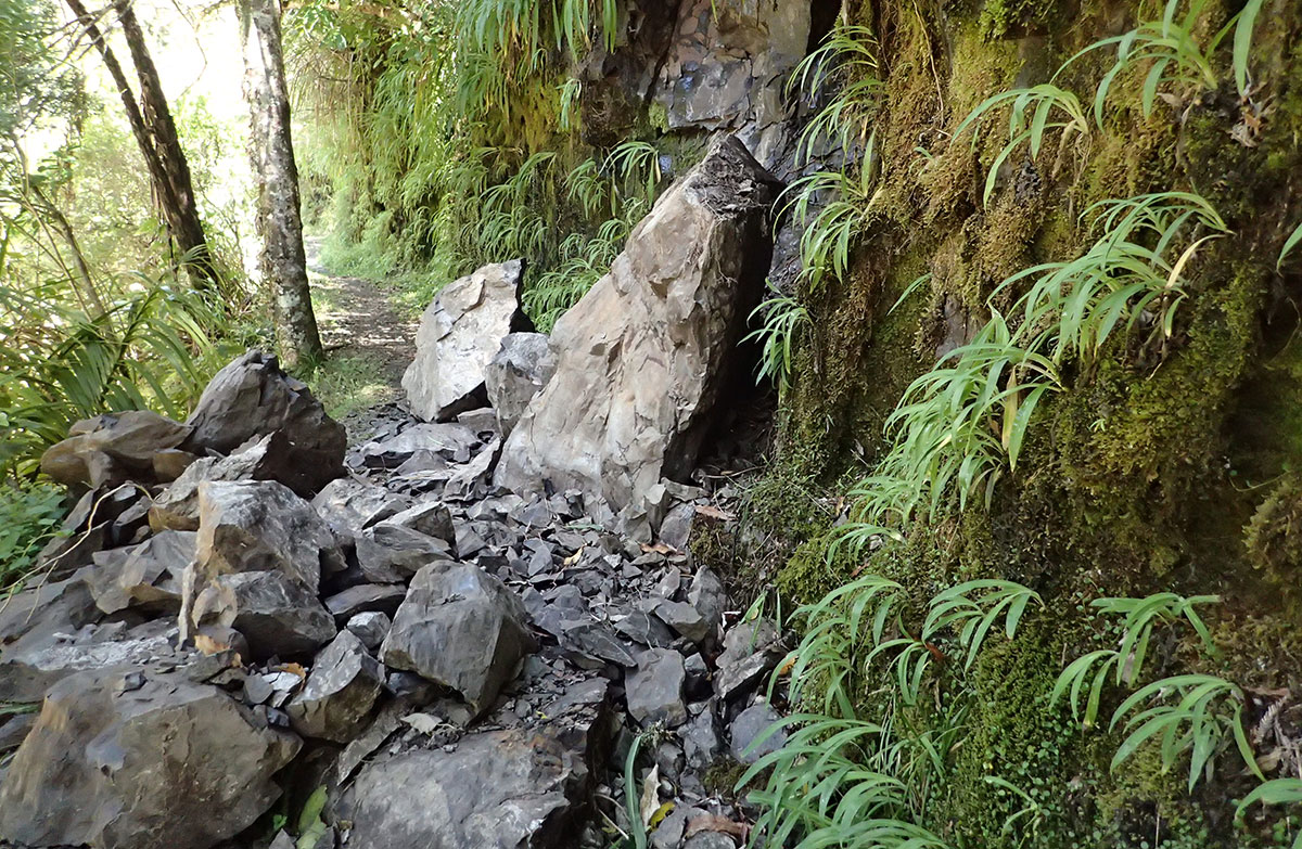 There are regular landslides, rockfalls and tree falls on this track. There are also steep drops beside the track in places. You will encounter: