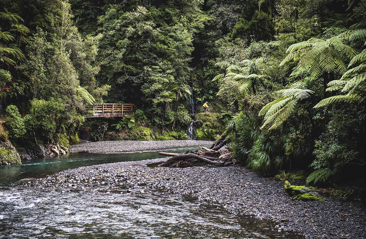 Around 1 km after the hut you reach the Pakihi stream suspension bridge, a spectacular 32-m structure that spans a pretty gorge. On both banks, look for the remains of the abutments of the original bridge, built 1913/14 and wrecked in a massive storm in 1918.