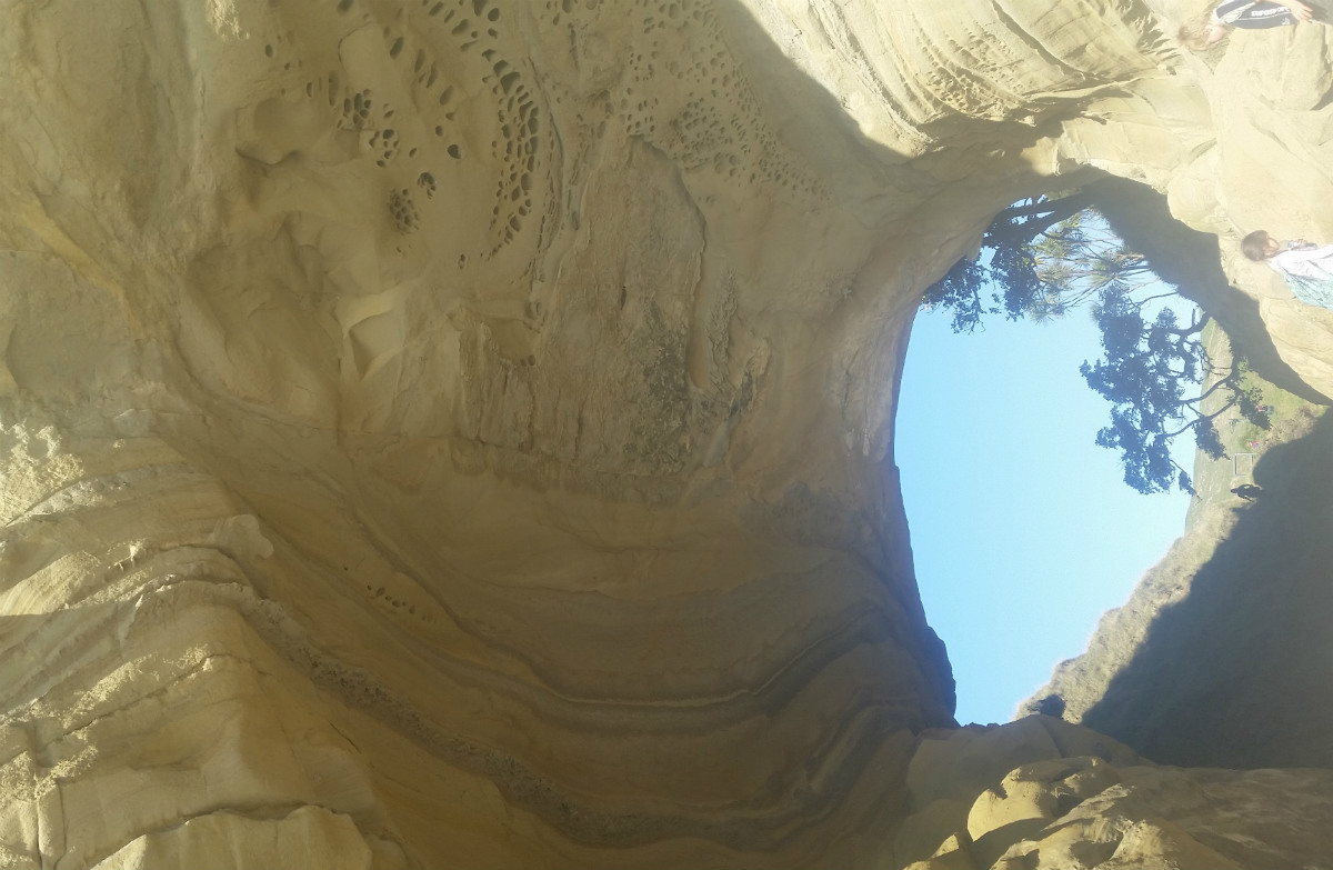 The track winds down through regenerating bush, and after 200 m passes a small pond and then enters the coastal flats of the cove. Here you can explore the hole-in-the-wall (Te Kotere o te Whenua) and inspect the New Zealand Historic Places Trust 1966 memorial, commemorating Cook's visit. Use the information panel shaped as a frame to take a photo. Grab a picnic lunch at the cove amongst the picturesque surroundings.