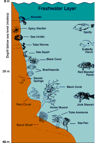Tannins, washed out of the vegetation on land, stain the water the colour of weakly brewed tea. This creates a dark layer on the surface that cuts down the amount of light entering the sea water, restricting most of the marine life to the top 40 metres. This band (below the freshwater layer) is calm, clear and relatively warm and is home to sponges, corals and fish of sub-tropical, cool water and deep water varieties.