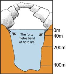 Although the fiords extend to depths of over 400 metres, life peters out quickly in the gloomy depths. The thin band of life extending around the shores of all 14 fiords is estimated to make up a habitat area of only 42 square kilometres, less than the area of Bluff Harbour on the Southland coast. Because of the small habitat area and the limited opportunity for exchange of material across moraine sills at the entrance to the fiords, these environments are vulnerable to over-fishing.