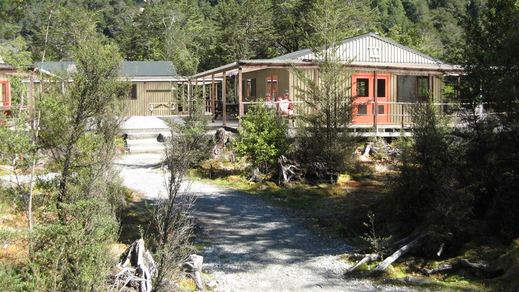 This is the first DOC hut on the Milford Track, in the Clinton Valley, Fiordland. It is about 1 to 1.5 hours walk from the head of Lake Te Anau.