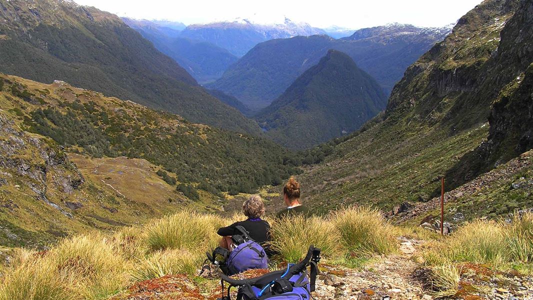 Enjoy stunning views of Tamatea/Dusky Sound from the open tops of the Pleasant Range (between Lake Roe and Loch Maree Huts).