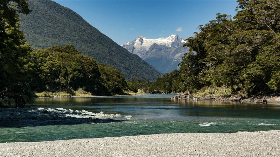The Hollyford Track then follows the true right of the Hollyford River/Whakatipu Kä Tuka, and after about an hour’s walk, reaches private dwellings and two airstrips.