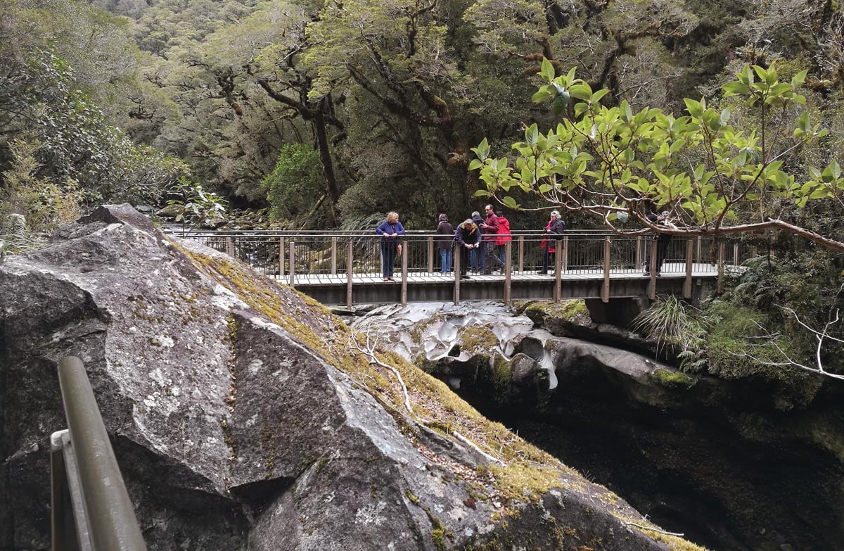 Thousands of years of swirling water have sculpted shapes and basins in the rock. The sheer velocity of water gives an appreciation of how much rainfall the Milford Sound area receives each year.