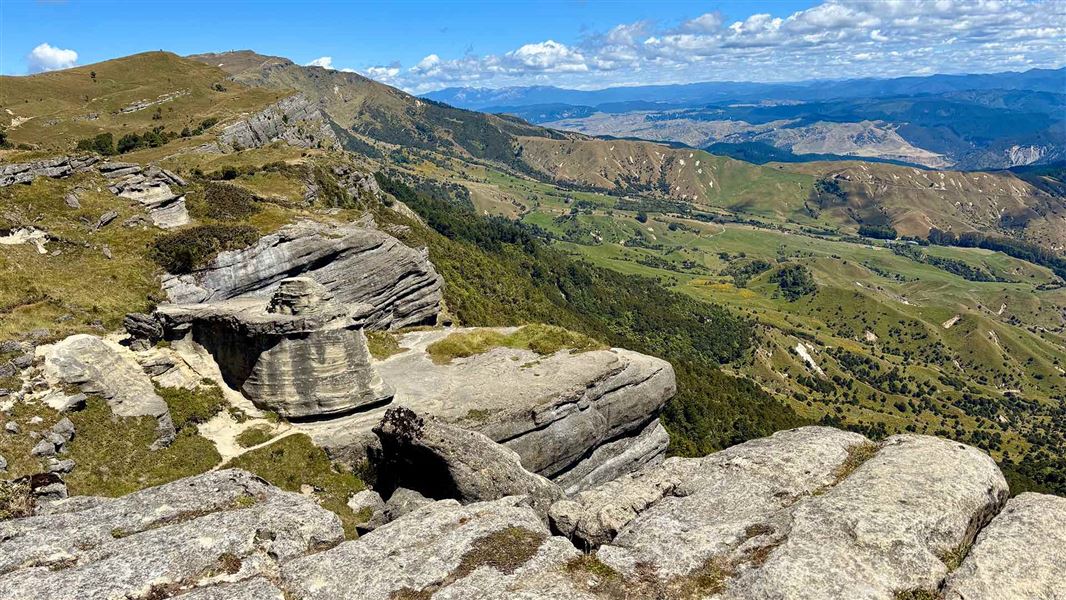 From the Pohokura Road entrance, the Bell Rock Loop Track climbs through a forest of gnarled broadleaf, horopito/pepperwood, fuchsia and mataī. The track emerges onto the range though a dense stand of mountain holly providing spectacular midsummer floral displays. Bell Rock is 40 minutes further along the left track.