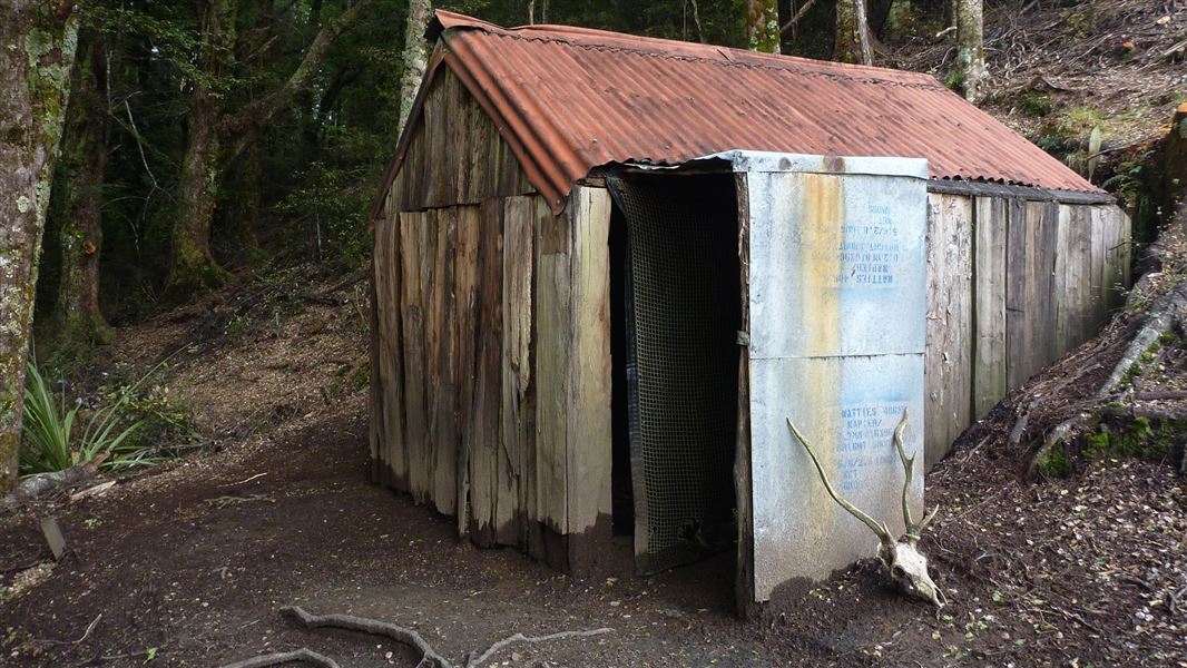 Unusually, for a mountain hut, Iron Whare is sited on a relatively steep slope and surrounded by forest.