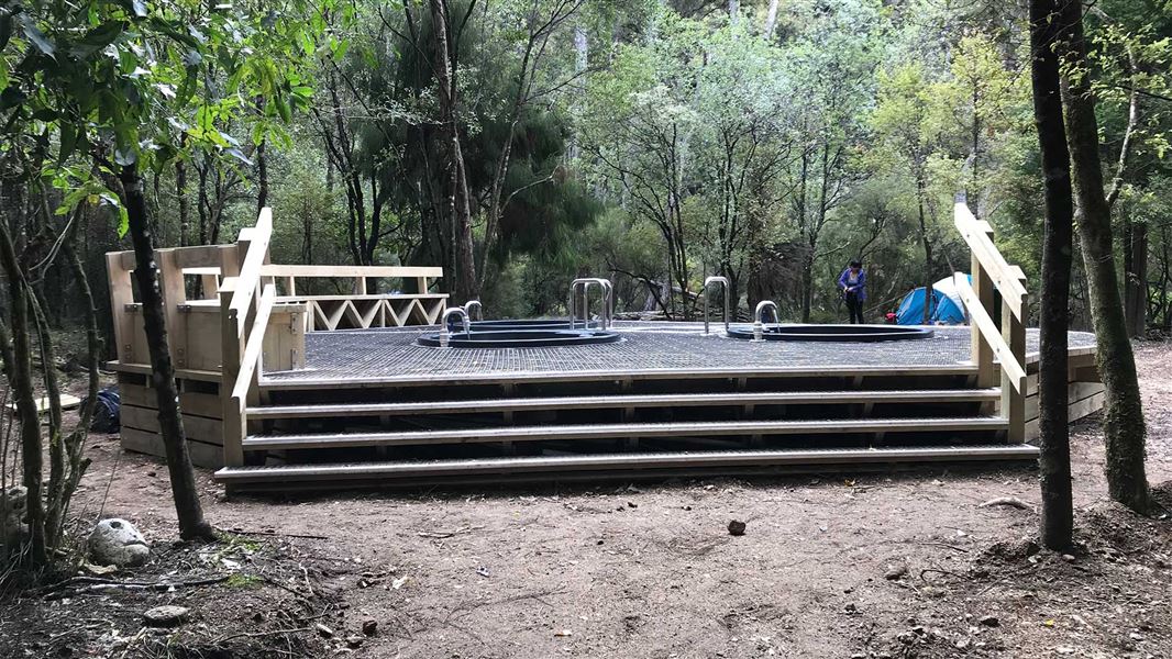 At the hot springs, there are 3 pools surrounded by a decking area. These pools have valves to control water flow and to empty the tubs. The hot springs are on a small manuka terrace beside the Mohaka River.