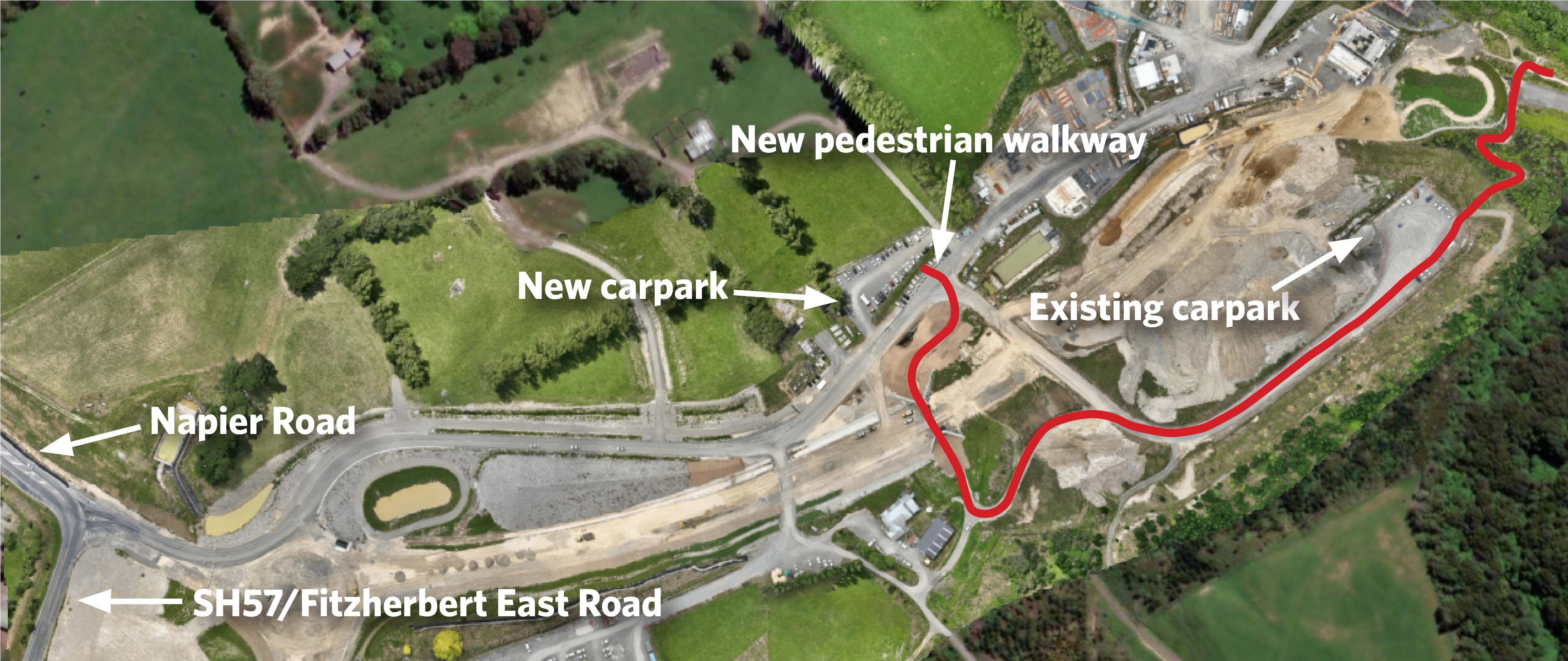 - from the west (Palmerston North/Ashhurst end), access to the Manawatu Gorge Track is via the Tawa Loop Track. Parking is at Western Gateway Park, 1631 Napier Road, Aokautere 4471. From the carpark, walk under the highway bridge and follow the Tawa Loop Walk signs. The walk starts near the carpark.