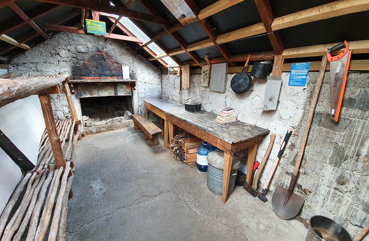 Shutes Hut is a rabbiter’s hut (4.0m x 2.4m) built of local stone and cement mortar which was laboriously packed in. It has a gabled roof with corrugated iron cladding. There is a fireplace at one end and it has a concrete floor. Shutes Hut is backed by mature trees to the south and open grass to the north.