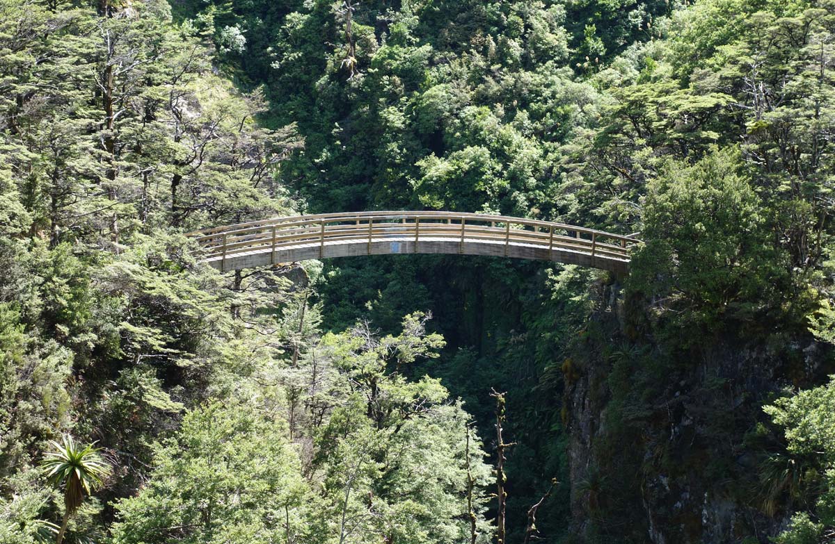 The track zig-zags above an active slip before crossing a deep ravine of the Mangahuia Stream via a picturesque arched wooden bridge.