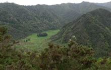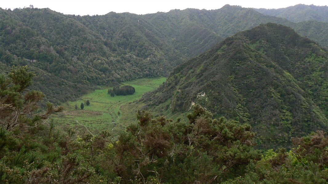 Beginning at the up-river end, the track climbs steeply from the River Road to a height of 260 m through fine lowland forest. Following an old, gently graded roadline for around 3 km the track follows the ridgeline to a clearing which marks the track's halfway point. A campsite with drinking water, a shelter and a toilet is available here.