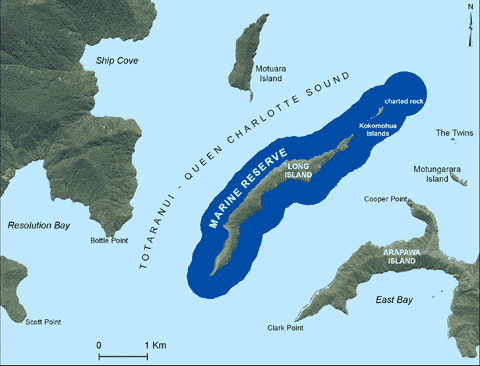 Long Island, Kokomohua Islands and a charted rock to the north-east, form a chain of islands and submerged reefs. The marine reserve extends 463 metres (a quarter of a nautical mile) offshore from the charted rock and from the high water mark around the islands.