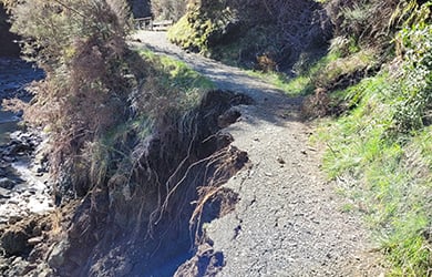 Many sections of the track between the car park and the Whispering Falls turnoff have been washed out by extreme weather events. The ground is unstable and more track sections could collapse.
