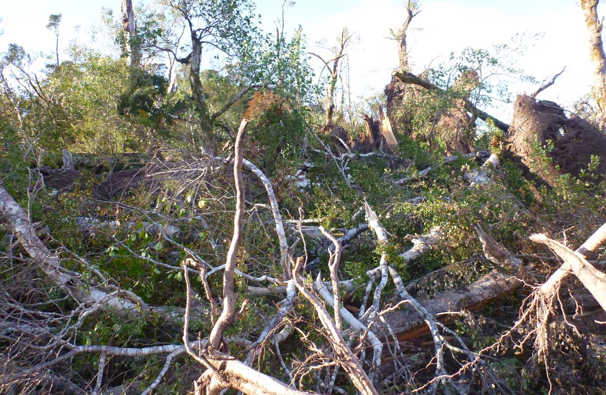 The track sidles on the western side of the ridge, eventually reaching a prominent spur which is followed to the left branch of the Wairoa River.