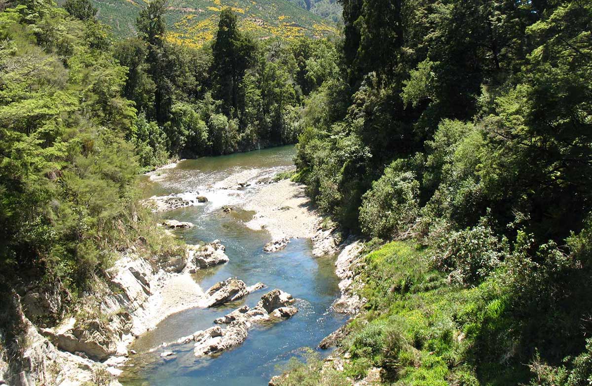 From the car park at the end of Mt Richmond Road, the track follows Te Hoiere/Pelorus River for an hour to Emerald Pool, an ideal fishing, swimming and picnicking spot. Beyond the pool, the track leaves the river and climbs a ridge, before zigzagging back down to the river and Captains Creek Hut.