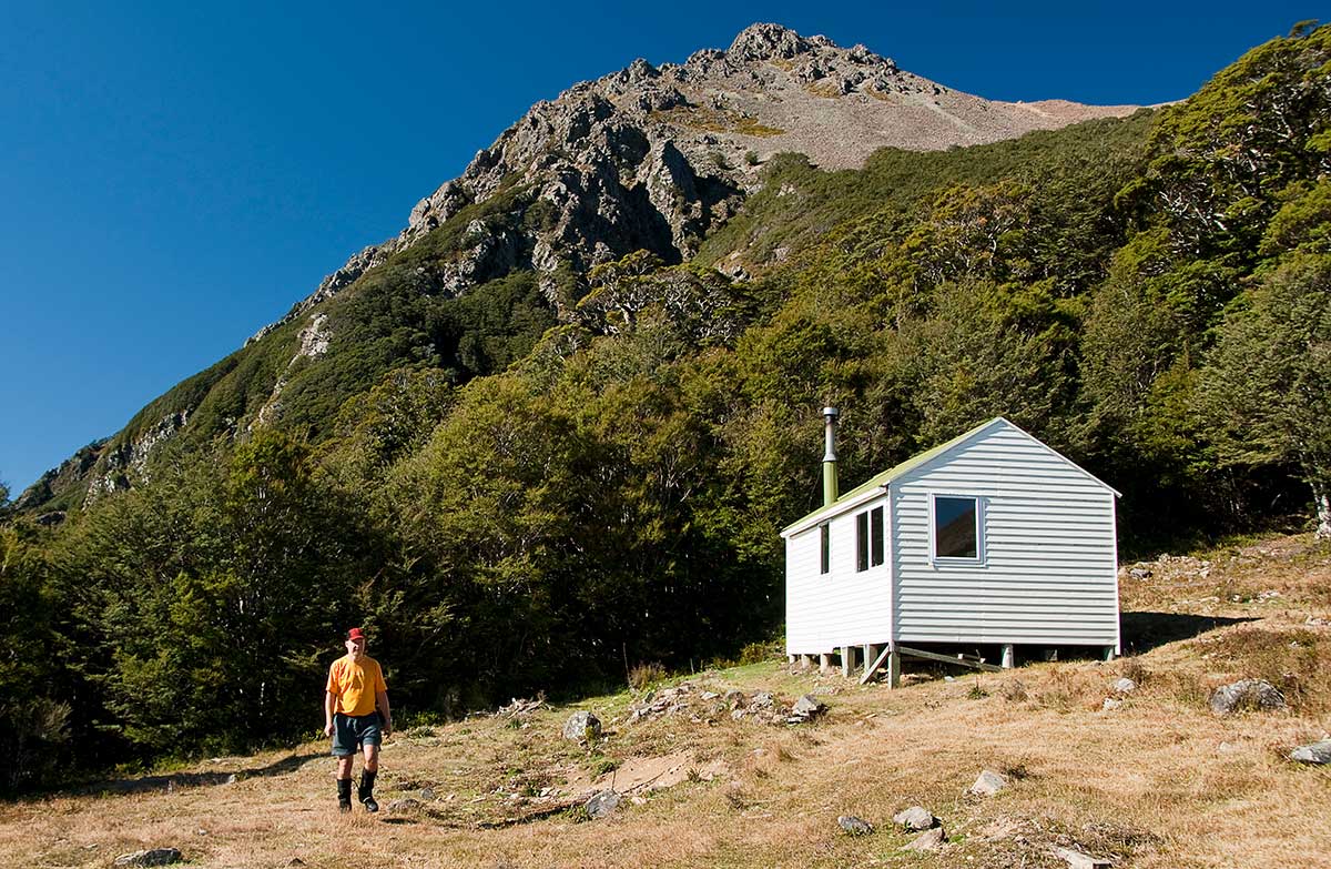 Just below Browning Hut cross Browning Stream and walk through a lovely section of forest. After the track junction, take the left-hand track towards Hacket Hut. The track crosses a small ridge, then follows a stream, crossing a few times down to Hackett Creek and Hacket Hut. Alternatively take the high river track.