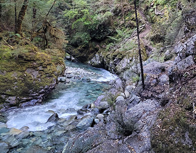 This section of track climbs up, sometimes steeply, and down from Te Hoiere/Pelorus River and its tributary creeks, crossing Captain Creek first, then the Pelorus and Fishtail Stream via swing bridges. From Fishtail Stream the track cuts across a broad loop in the river on a wide terrace. It rejoins the river and follows it to Middy Creek Hut.