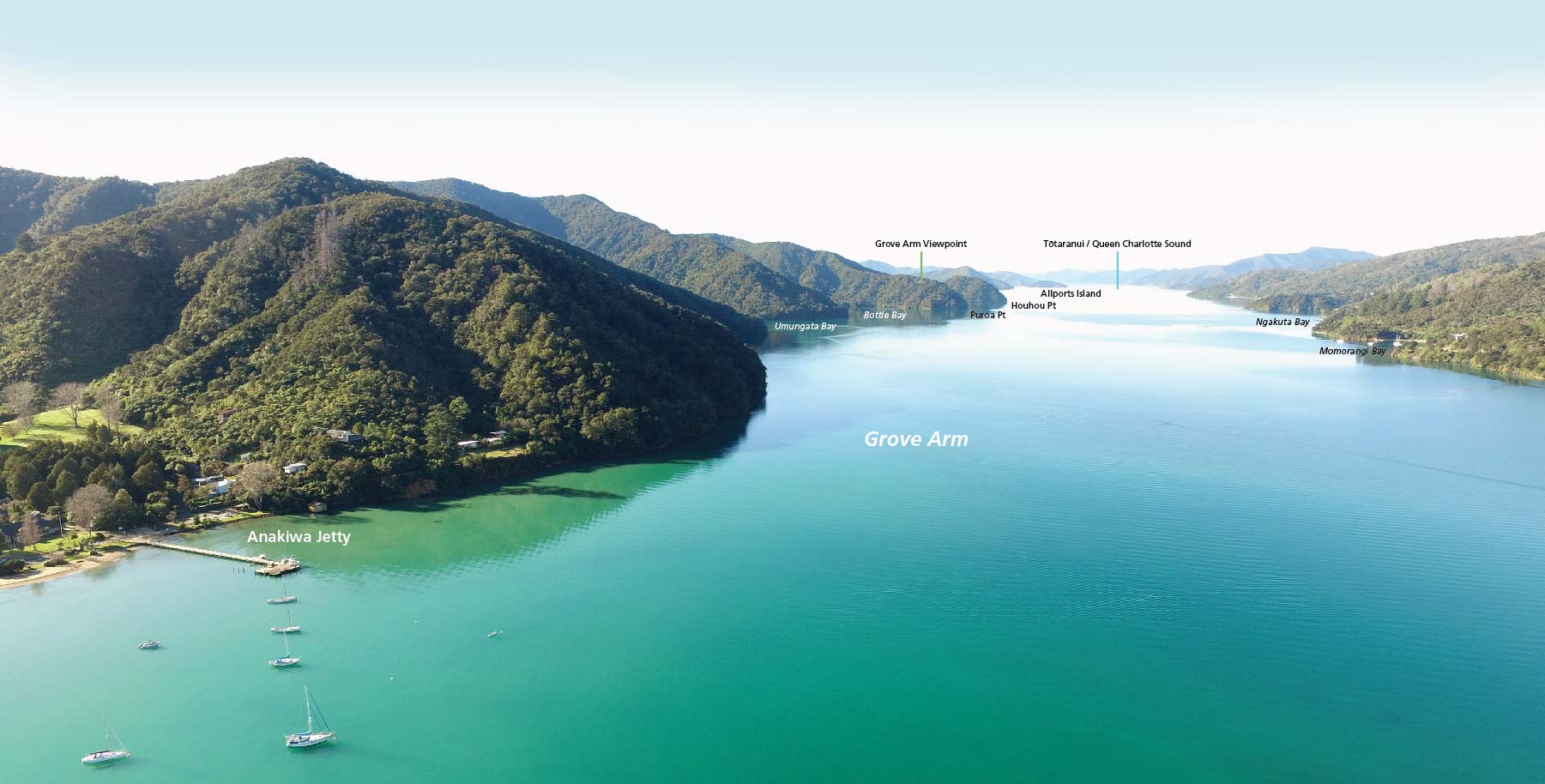 Looking at the southwestern corner of Iwituaroa Scenic Reserve, seen at left. Some of the finest stands of native forest in Marlborough are contained within the Reserve. The track passes through it between Anakiwa and Grove Arm Viewpoint