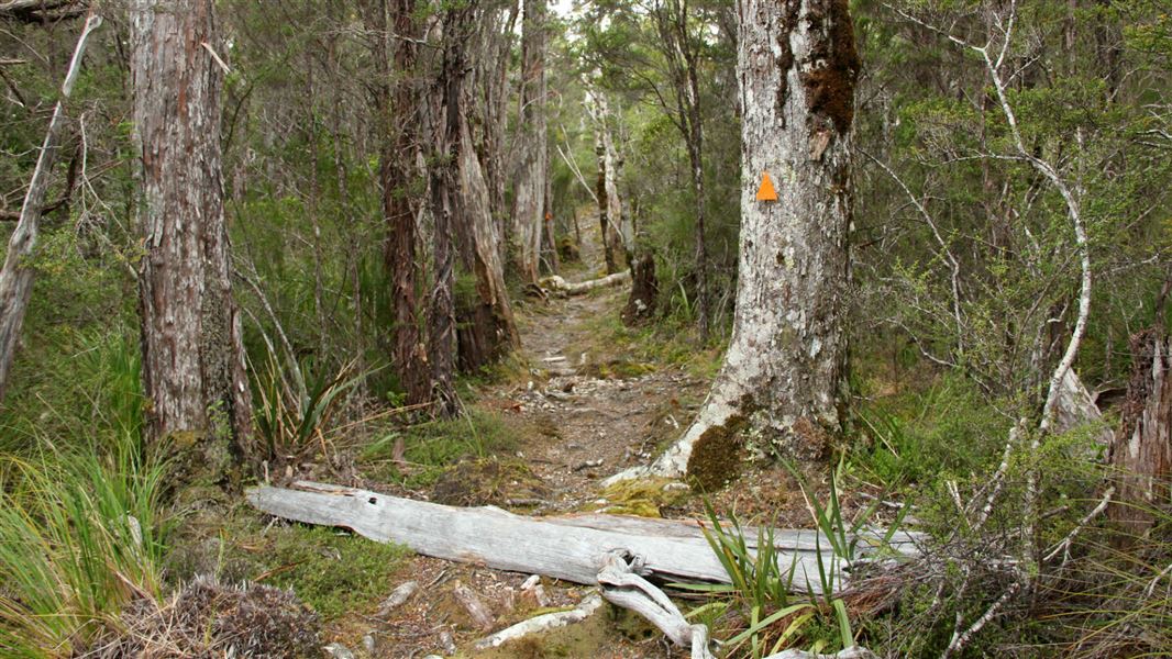 From Moa Park Shelter the track crosses a small stream and quickly re-enters the stunted beech forest. Upon reaching Evans Ridge it turns north, beginning a gradual descent to Awapoto Hut.