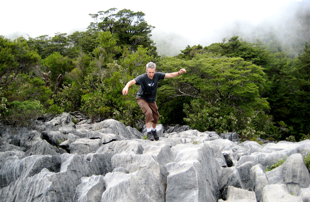 Once you arrive at the junction in the track, follow the left-hand branch to go to Harwoods Hole. The track stops at large rocks near Harwoods Hole, with views of the impressive cliffs surrounding the hole. This enlarged sinkhole drops to an underground river that emerges below and flows into Gorge Creek and then into the Tākaka River