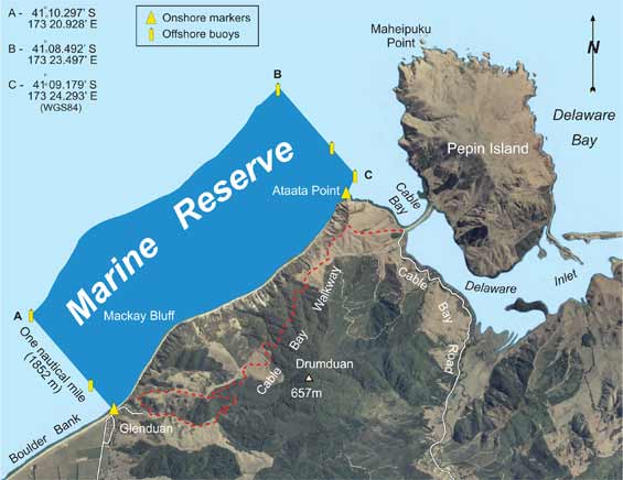Horoirangi Marine Reserve covers 904 hectares and extends offshore for one nautical mile (1852m) from the mean high water mark between Glenduan and Ataata Point, the southern headland of Cable Bay.