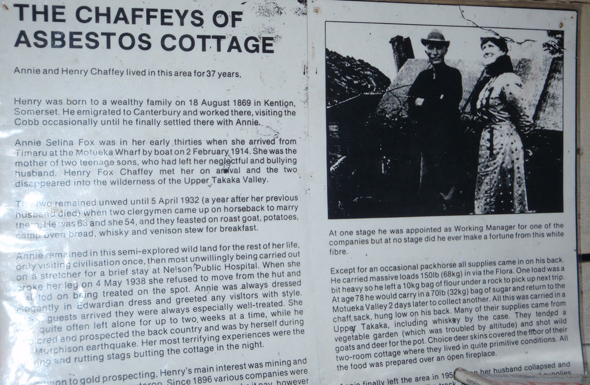 Chaffey spent many years mining and trying to encourage commercial interest in the local asbestos deposits as well as searching for other minerals. Henry was in regular contact with the outside world through his mining ventures and trips out to Motueka and Takaka for supplies. Annie however remained a recluse leaving the hut only once for an urgent operation at Nelson Hospital. She always dressed in Edwardian-style clothing for visitors who were required to signal their approach with a loud “cooee!”