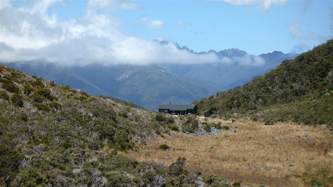 Situated in the fold of Perry Saddle with high hills either side, the hut has an alpine feel. There are spectacular views out to the distant tooth-shaped peaks known as Dragons Teeth and Mt Olympus, and glimpses of the red tussock grasslands that the track crosses.