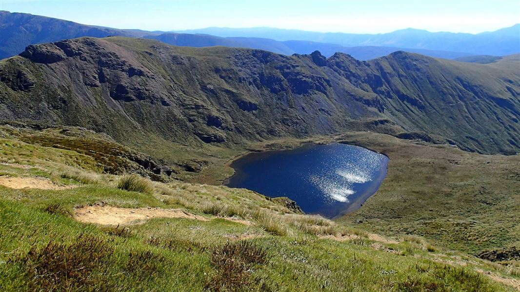 From Lake Peel, a tramping track sidles up on to a ridge and then descends slowly to Balloon Hut (1 hour 30 minutes).