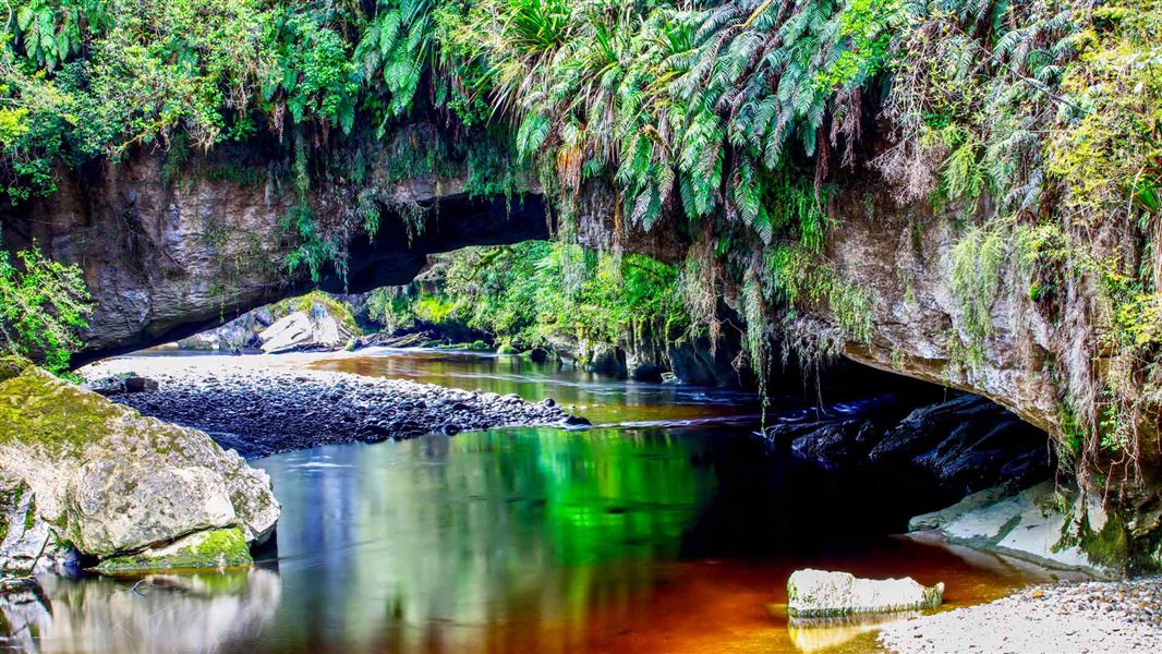 Follow the track to beautiful Moria Gate Arch, named in 1984 after the gate in the Lord of the Rings trilogy. It is worthwhile going underneath the arch via a short side track to view the naturally sculptured limestone and maybe spot a native blue duck/whio feeding in the whiskycoloured waters of the Ōparara River.