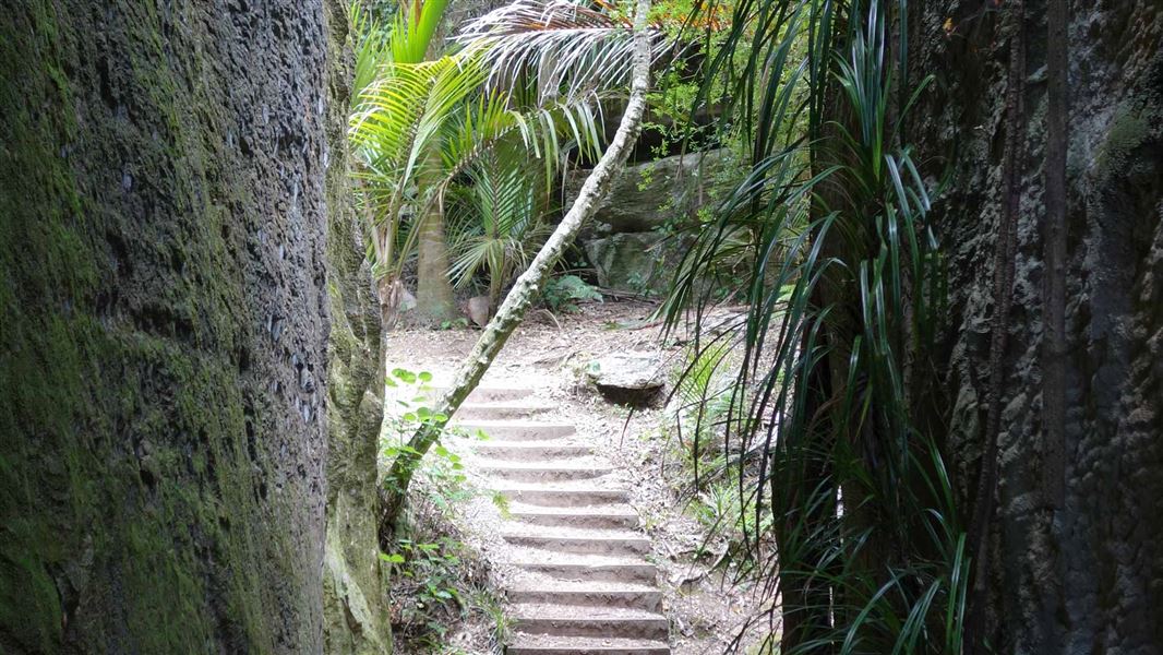 Usually, northern rātā begins its life in accumulated forest debris high in the branches of a tree. At the Grove, however, sufficient plant material is available on the limestone blocks for rātā to take a hold there. As the rātā trees get bigger, they send roots down to the ground, enveloping their rocky hosts like a giant hand.
