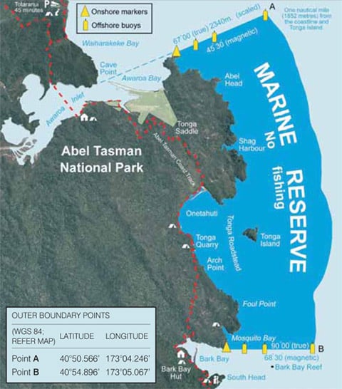 Tonga Island Marine Reserve covers an area of 1835 hectares, extending one nautical mile (1852m) offshore from the mean high water mark of Tonga Island, and the coast between Awaroa Head and the headland separating Bark Bay and Mosquito Bay.