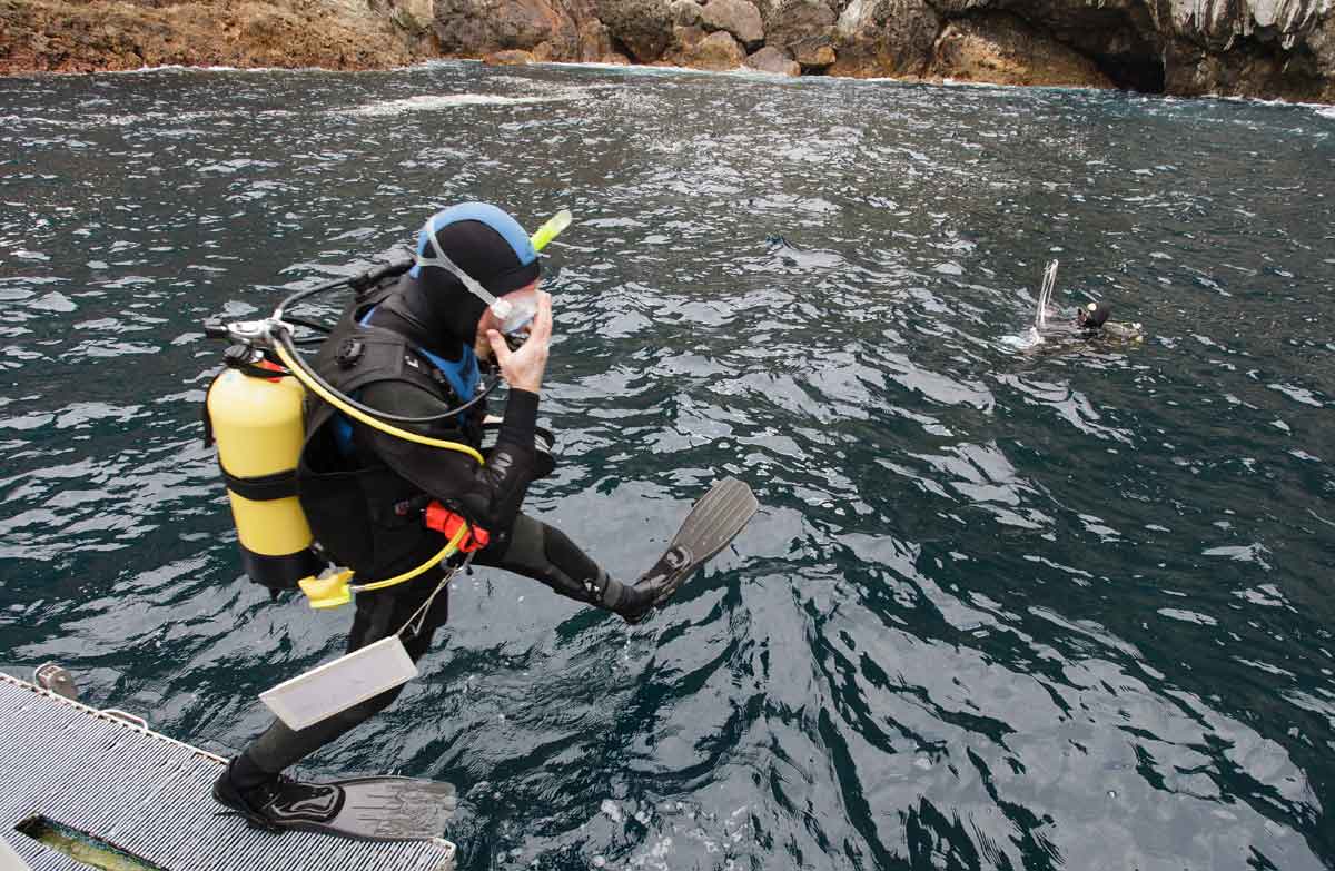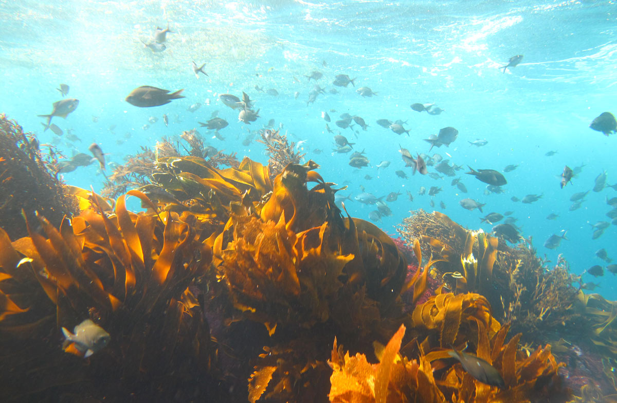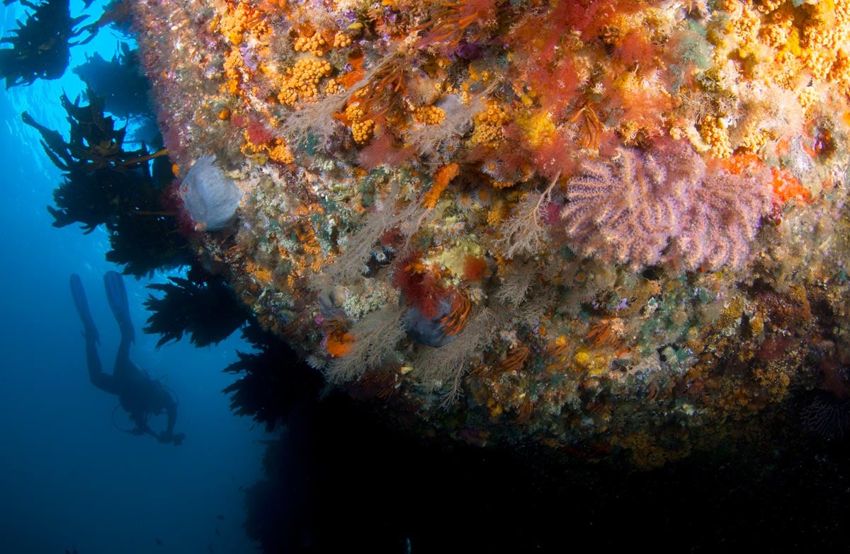 Beneath the waves the caves, arches, tunnels and sheer cliffs provide a great variety of habitats to explore. From turbulent sunlit waters and kelp forest on the upper reaches of the tumbling giant ‘staircase’ to the dark waters of the islands’ many caves, the Poor Knights offer an extraordinary variety of underwater experiences.