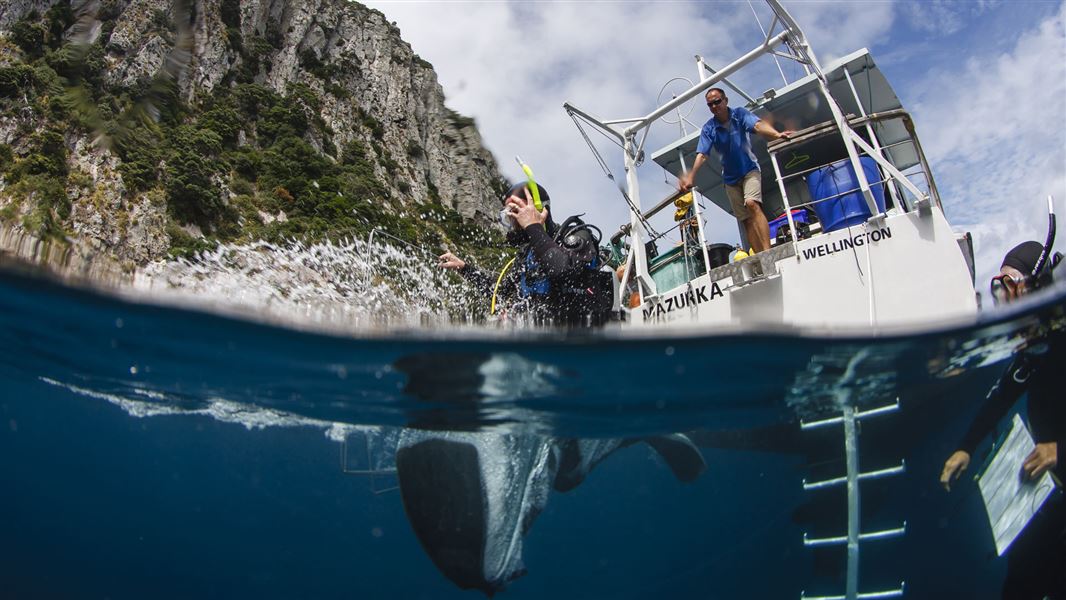 Beneath the waves the caves, arches, tunnels and sheer cliffs provide a great variety of habitats to explore. From turbulent sunlit waters and kelp forest on the upper reaches of the tumbling giant ‘staircase’ to the dark waters of the islands’ many caves, the Poor Knights offer an extraordinary variety of underwater experiences.