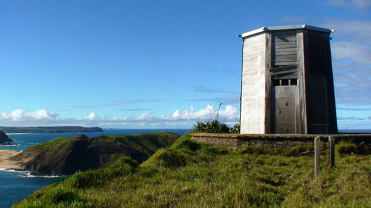 However, by the beginning of WWII, it was decided that the light was in the wrong location, so in 1941 the glasshouse and light mechanism on top of the lighthouse were removed and re-erected at the new lighthouse settlement at Te Rerenga Wairua. The remains of the original tower can still be seen on the northern end of the offshore island.
