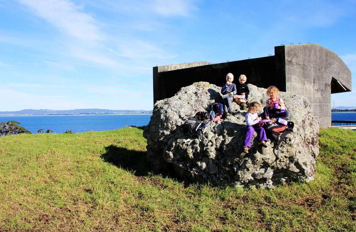 You will walk past the gun emplacement at Home Point. This was built during World War II as a defence against possible invasion. The six-inch naval gun was aimed with the help of a camouflaged radar station on the ridge above Ocean Beach. Inside the remote control room is a landscape painting of the Bream Bay area. It offers a unique interpretation of what the area look like before the construction of the Marsden Point Oil Refinery.