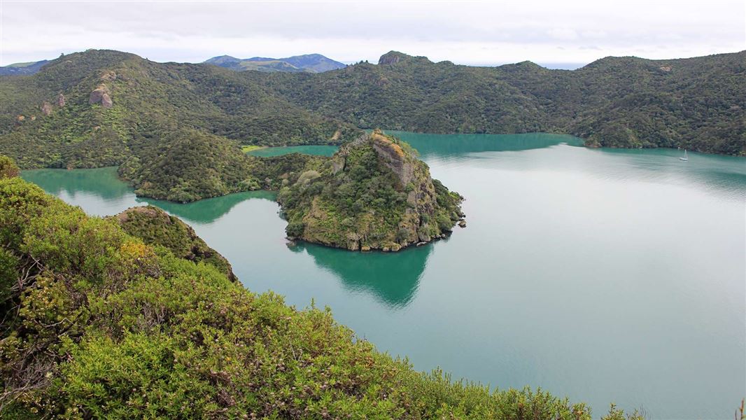 The Duke’s Nose (Kaiaraara Rocks) track starts behind Lane Cove Hut and day shelter, Pekapeka Bay, Whangaroa Harbour.