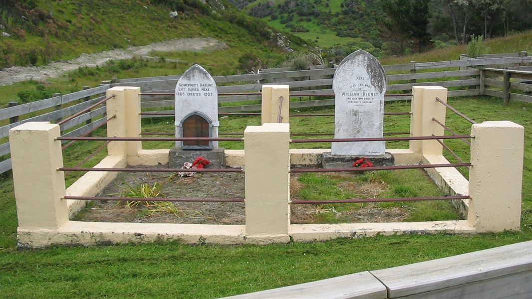 Sometime later Rigney and a fellow miner named Ord erected a fence of manuka poles around the grave. Later Rigney obtained a piece of black pine and having shaped it into a headboard used a tomahawk and a four-inch nail to engrave the words ‘Somebody’s darling lies buried here’.