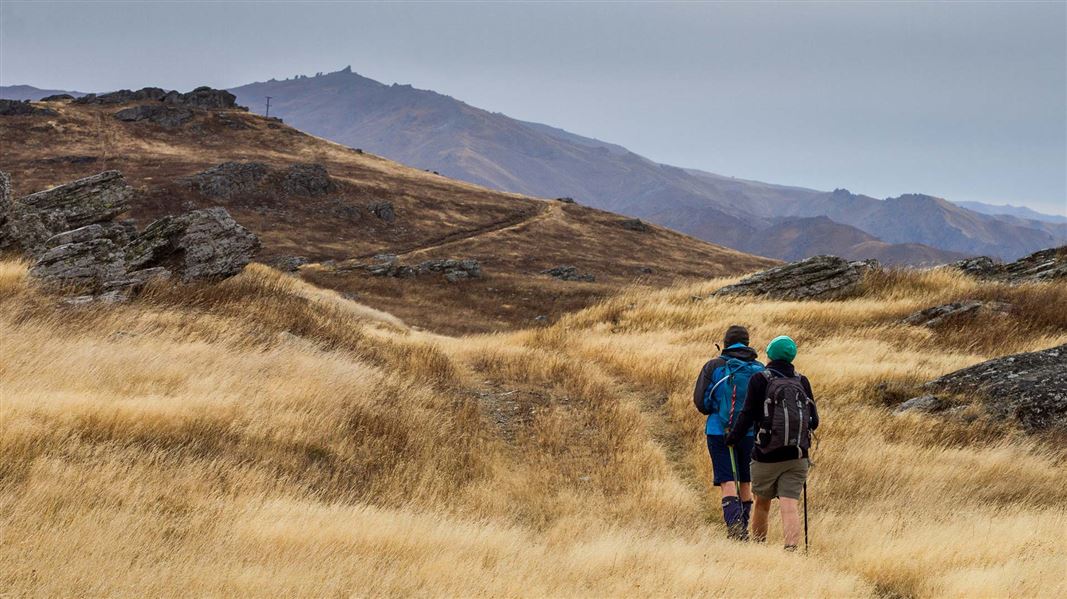 From Cairnmuir Hill, the track heads northwest along the ridge then drops into the middle reaches of Cairnmuir Gully. There is a well-preserved boundary rider’s stone hut from the 1860s where the 4WD track crosses the creek. From there, the track climbs out of the gully until another fence line and track junction is reached. Turn right towards Cromwell and follow the marked 4WD track down to the Cornish Point Road car park.