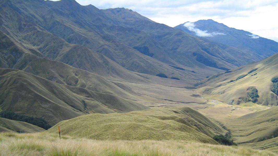 After crossing Highland Creek the marked track sidles and climbs above an unnamed creek onto a prominent spur. It continues up this spur before sidling along a steep tussock face; stunning views across the Motatapu Valley are a highlight of this section. The track then drops into a small gully and crosses the creek through a small patch of beech forest, then climbs out onto the leading south-west ridge off Knuckle Peak. Follow down this ridge to the Motatapu River. The 12-bunk Roses Hut is an easy tramp across the open flats.