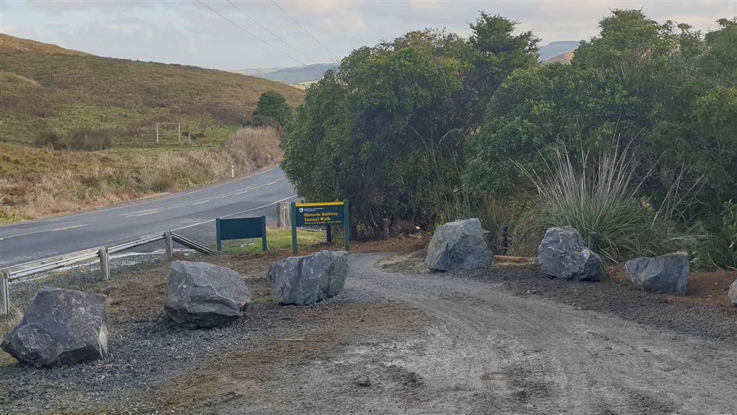 The walk follows the fence line down to the old railway formation, which leads to the 250-metre tunnel. Walk through to follow the tracks to a picnic area overlooking the local farmland and scenery.